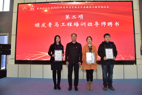 开班仪式在雄壮的国歌中开始。为更好的拓宽青马学员学习视野,帮助学员更好的学习马克思主义理论及党的新思想、新理论,今年校团委印发《关于聘任东北农业大学青年马克思主义者培养工程培训班成长导师的决定》文件,特聘请于兴业、宋跃芬、张永强、许静波为我校“青马工程”成长导师。马宏坤为培训班成长导师颁发聘书。随后,“青马工程”的成长导师们为培训班各班级授旗。