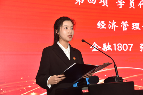 本期“青马工程”培训班学员代表,经济管理学院金融1807班张露艺代表学员发言,代表全体学员宣誓要在青马班认真学习,塑造自己,努力成为堪当时代大任的青年马克思主义者。