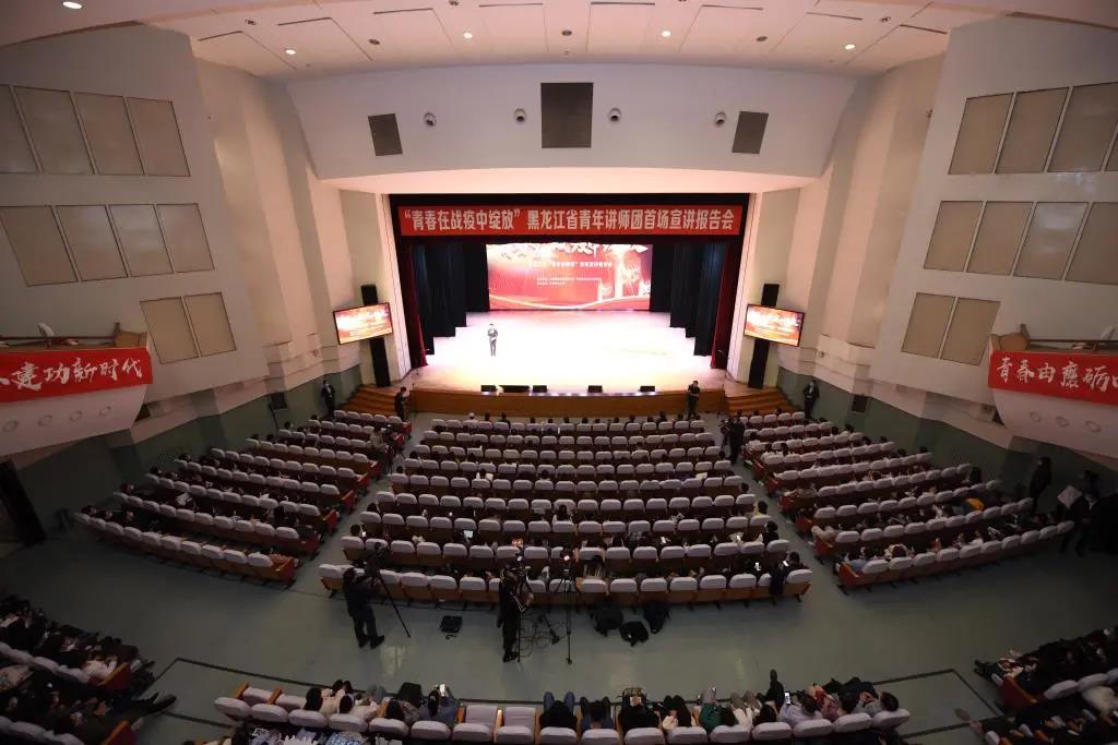 11月12日下午,“青春在战疫中绽放”首场宣讲报告会在我校音乐厅剧场举行。省委常委、宣传部部长贾玉梅,省委副秘书长、省直机关工委常务副书记荣利彬,团省委书记苑芳江,省残联党组书记、理事长董濮,哈尔滨医科大学党委书记张斌,省总工会党组成员、副主席王东明,团省委副书记张涛,省妇联党组成员、副主席王霞,我校党委书记孙登林,党委副书记、校长包军,党委副书记马宏坤,党委副书记庞玉红,党委常委、副校长王泽方等领导出席宣讲报告会。省青年讲师团成员、各市地团委分管宣传工作负责同志、省直单位及高校团委负责人、团省委机关干部、2020黑龙江共青团新媒体工作培训班以及我校青年师生代表共700余人参加报告会。