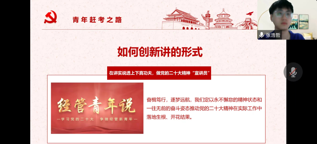 经济管理学院2020级的张浩哲同学在此次分享会结合此前习总书记在清华大学考察时的倡议:青年一代要埋头踏实苦干,勇求卓越,我们要以二十大精神为指引推进民旅复兴伟大征程。同时我们要做到,一:筑牢“学”的基础加深自己的学习与领悟,争当理想主力军。二:创新“讲”形式,做党的二十大精神宣讲员,用创新形式向广大学生群体宣扬二十大精神。三:做是“用”的文章肯下硬功夫,不折不扣学习二十大精神,全力战胜各种困难与挑战,为奋斗绽放绚丽之花。