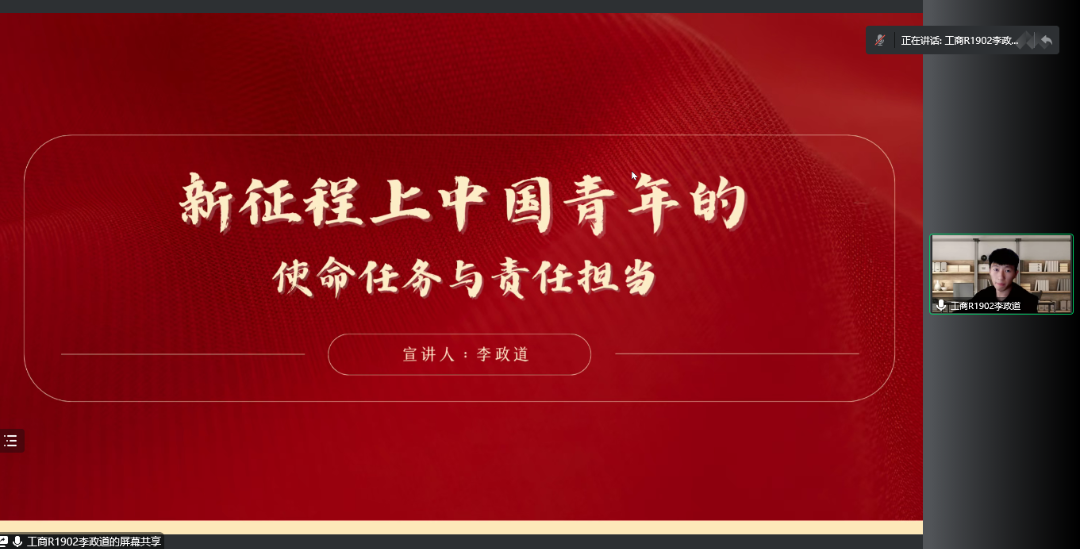 国际文化教育学院2019级李政道同学结合党的二十大报告中习近平总书记对青年一代的殷切期望,从三个方面层层递进论述了新征程上青年的担当与职责,为广大青年在新征程上投身全面建设社会主义现代化国家提供了根本遵循。李同学在会上指出新征程上青年生逢其时,无比幸运,更要明白使命在肩,责任重大,做到坚定不移听党话,跟党走,肩负起新时代新征程的历史使命。
