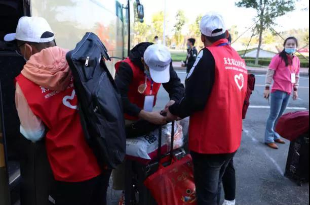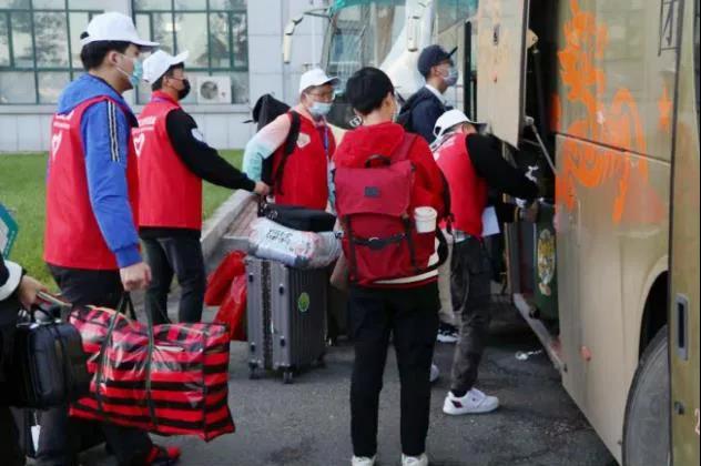 搬运行李组:志愿者按照下车顺序帮助新生摆放行李箱,待新生做完核酸检测后帮助把行李搬运到指定乘车点。