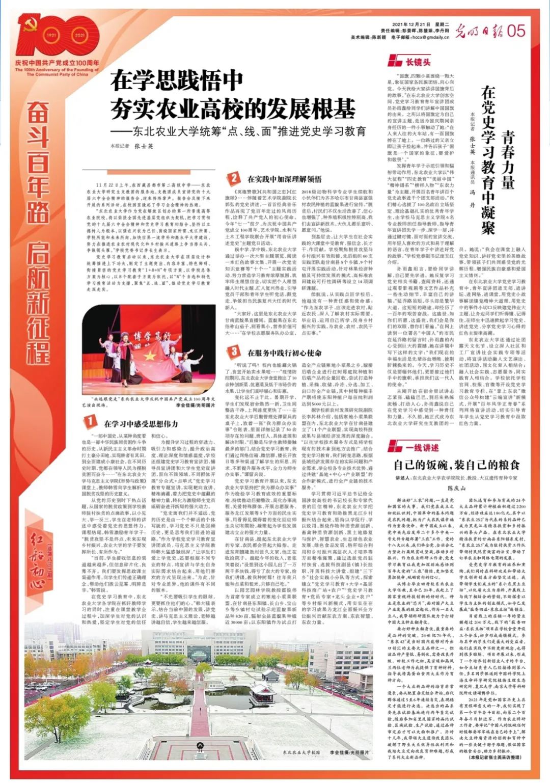 在东北农业大学党史学习教育中,青年宣讲团进支部、进讲坛、进网络、进课堂,用党史小故事解读建党精神大道理,用党史中的事件小切口反映建党伟业大主题,让身边同学们听得懂、记得住,在师生中迅速掀起学习党史、讲述党史、分享党史学习心得的红色主旋律高潮。