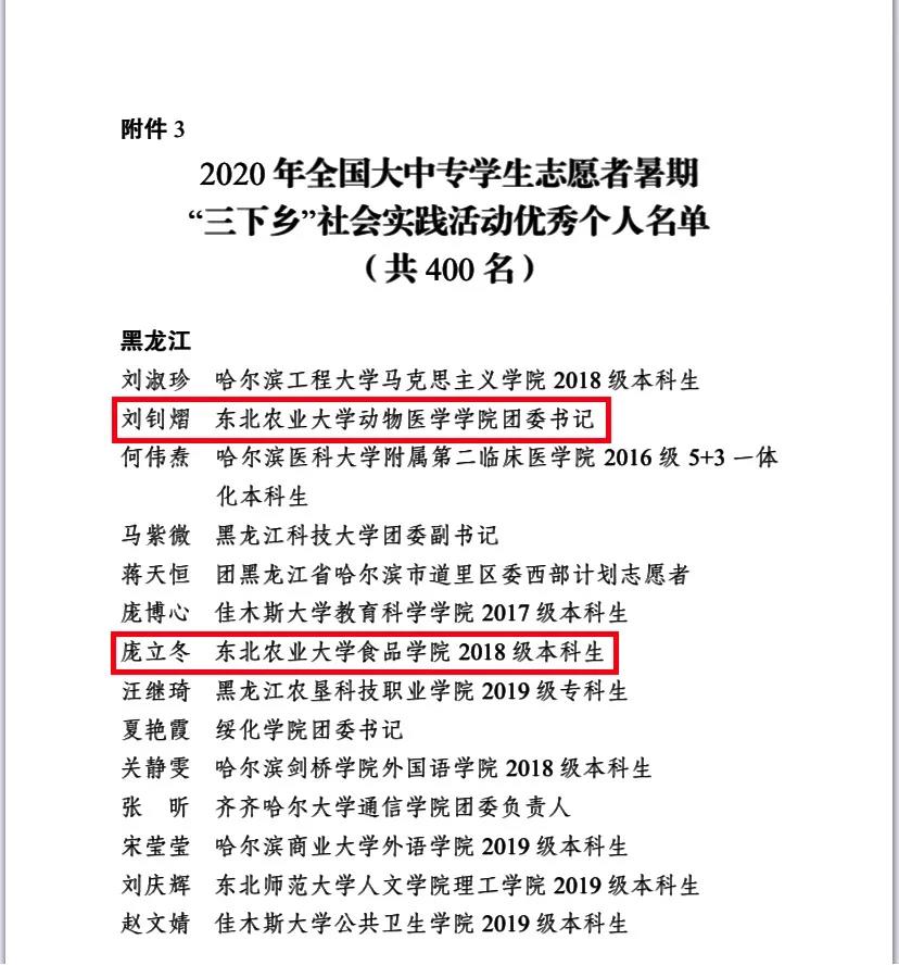 近日,团中央学校部、全国学联秘书处联合开展了2020年全国大中专学生志愿者暑期“三下乡”社会实践活动总结通报工作。校团委获评2020年全国大中专学生志愿者暑期“三下乡”社会实践活动优秀单位,动物医学学院团委书记刘钊熠、食品学院食科1881班学生庞立冬获评暑期“三下乡”社会实践活动优秀个人。