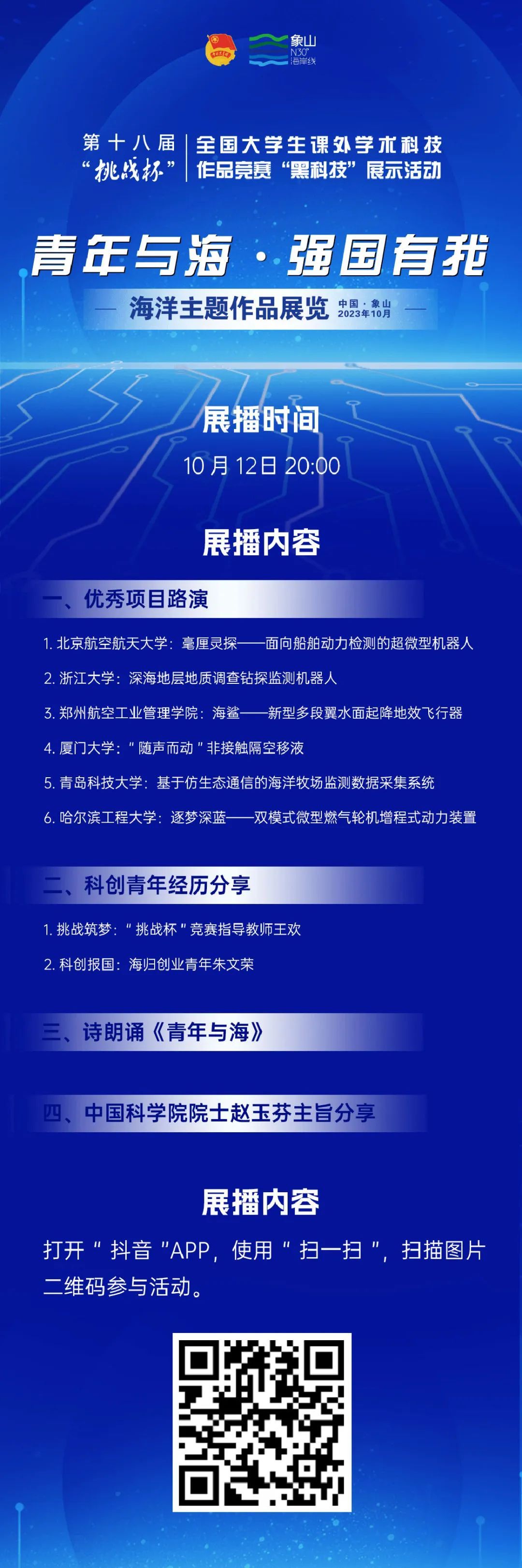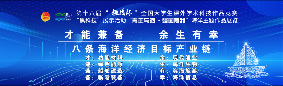 为进一步增强第十八届“挑战杯”全国大学生课外学术科技作品竞赛的交流性,结合第十七届中国(象山)海洋论坛暨2023“青年与海”创新创业大会安排,集中宣传展示青年学子“黑科技”海洋主题作品风采,团中央青年发展部面向全国组织开展第十八届“挑战杯”全国大学生课外学术科技作品竞赛“黑科技”展示活动“青年与海·强国有我”海洋主题作品展播活动。来自全国65所高校、80件作品参与展示,全面涵盖了功能材料、绿色能源、船舶建造、临港装备、现代渔业、海洋生物、滨海旅游、海洋信息等当前海洋科技所涉及的领域。
