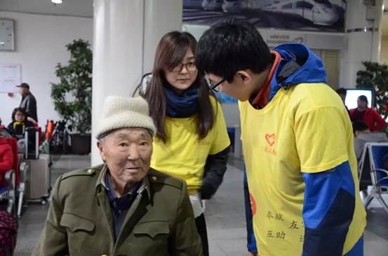 青春铁路线志愿者帮助行动不便的老人前往车厢