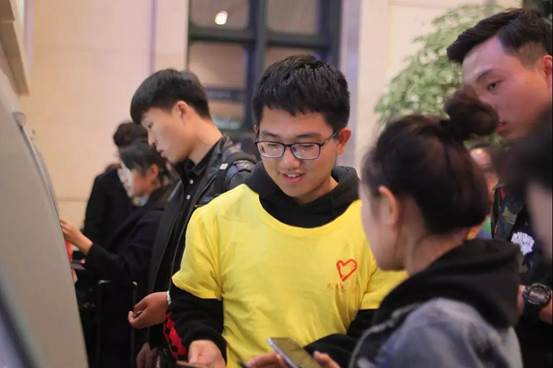 青春铁路线志愿者帮助旅客使用自动售取票机器