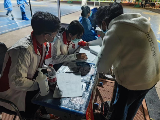 8月28日深夜,服务队接到紧急任务:组织群众连夜进行核酸检测工作。服务队成员们立即到达核酸采集点,进行核酸采集前的准备工作,凌晨12点开始配合学校和医护人员进行核酸采集登记,直至凌晨5点顺利完成本次全员核酸检测工作。
