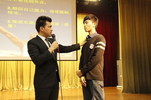 台上,他与现场观众互动,用简单的催眠术来展示潜意识的力量,并耐心解答同学们提出的问题,他用平实的语言、鲜活的事例、有趣的互动鼓励同学们培养积极阳光的心态,提高情绪控制力。最后,夏东豪与同学们分享了电影《面对巨人》中的励志片段,鼓励同学们在遇到困难时不言放弃,感激那些一直不离不弃提供帮助的人。持续2个小时的讲座在近500名同学的掌声中落下帷幕。