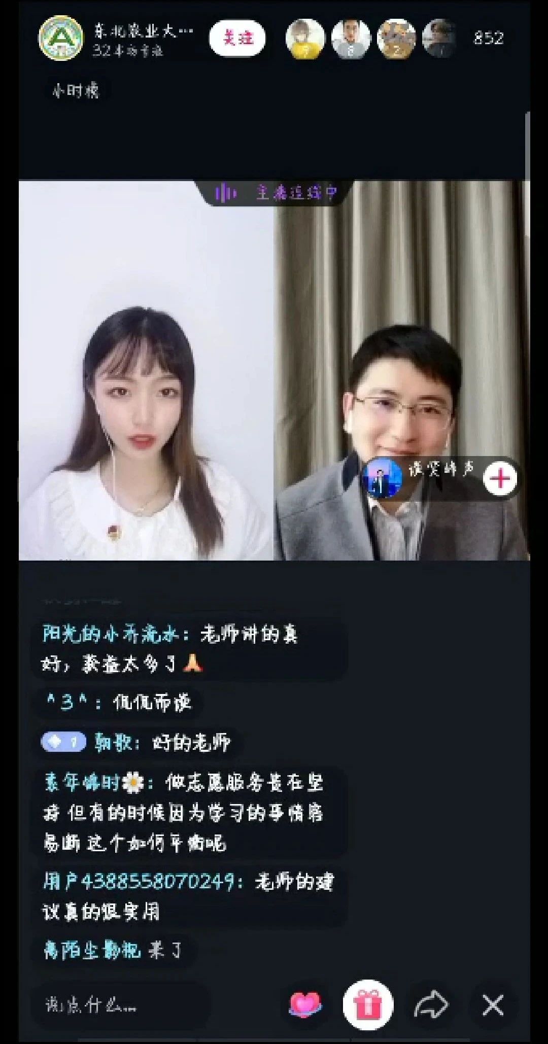 讲座尾声,对于同学们积极提出的关于志愿服务问题,胡老师给予了详细、耐心的解答。互动中胡老师谈到,由于年纪轻、阅历浅,大学生志愿团体还存在很多不够完善的地方,对此,他从调整服务形式、规划服务时间、团队合作排班等多方面提出切实可行的解决方案,观看直播的同学们纷纷表示受益颇多。