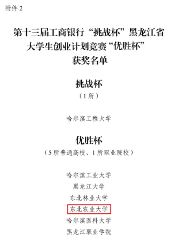 近日,由团省委、省教育厅、省人社厅等部门举办的第十三届工商银行“挑战杯”黑龙江省大学生创业计划竞赛获奖集体和个人表彰名单正式发布,我校获得金奖9项、银奖10项、铜奖10项,向文胜、陈庆山、姜毓君等14名教师荣获“优秀指导教师”称号,学校获得本届大赛“优胜杯”。