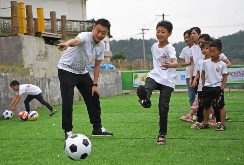 在江西省贵溪市金屯镇金屯村渡坊村小组,志愿者和留守儿童一起进行体育活动(2020年5月27日摄)。