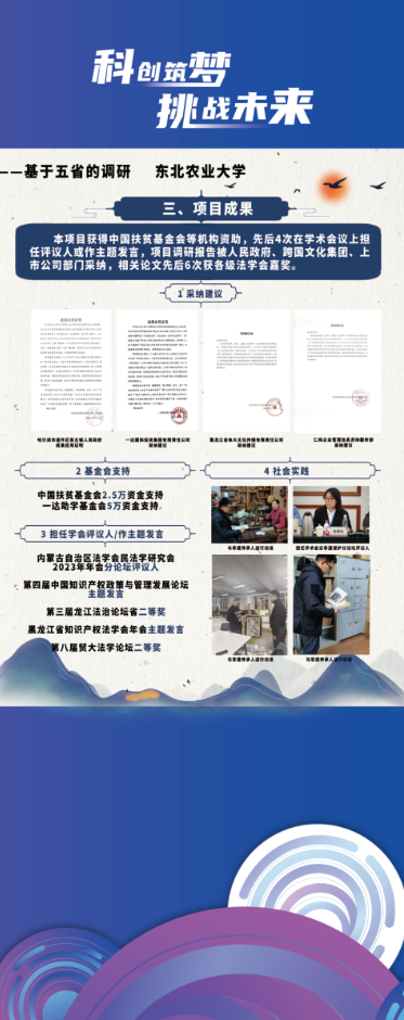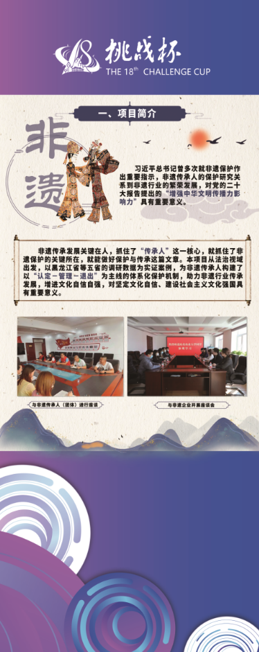 我校获国家二等奖作品由公共管理与法学院教师刘慧萍指导,张家榕、王鑫宇、吴鑫怡、张洁榕、朱妍昕、林思妍、唐清馨等人作为团队成员共同完成。项目从法治视域出发,以黑龙江省等五省的调研数据为实证案例,为非遗传承人构建了以“认定-管理-退出”为主线的体系化保护机制,助力非遗行业传承发展,增进文化自信自强,对坚定文化自信、建设社会主义文化强国具有重要意义。项目在学术研究、社会效应、成果推广方面取得了良好成效。项目成员先后4次在学术会议上作主题发言或担任评议人,相关论文先后6次获各级法学会嘉奖;项目调研报告被民主镇人民政府、一达国际投资集团等多家单位采纳,并在杨林乡中心小学实践推广,取得了积极的社会效果。