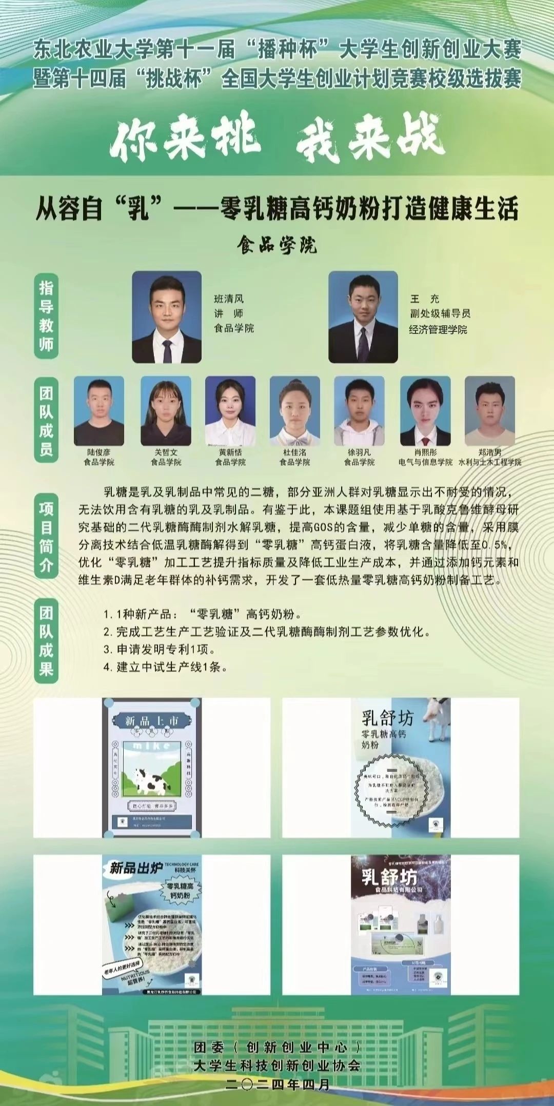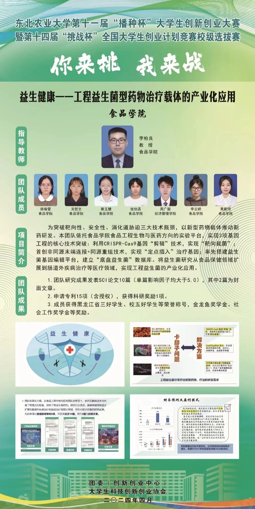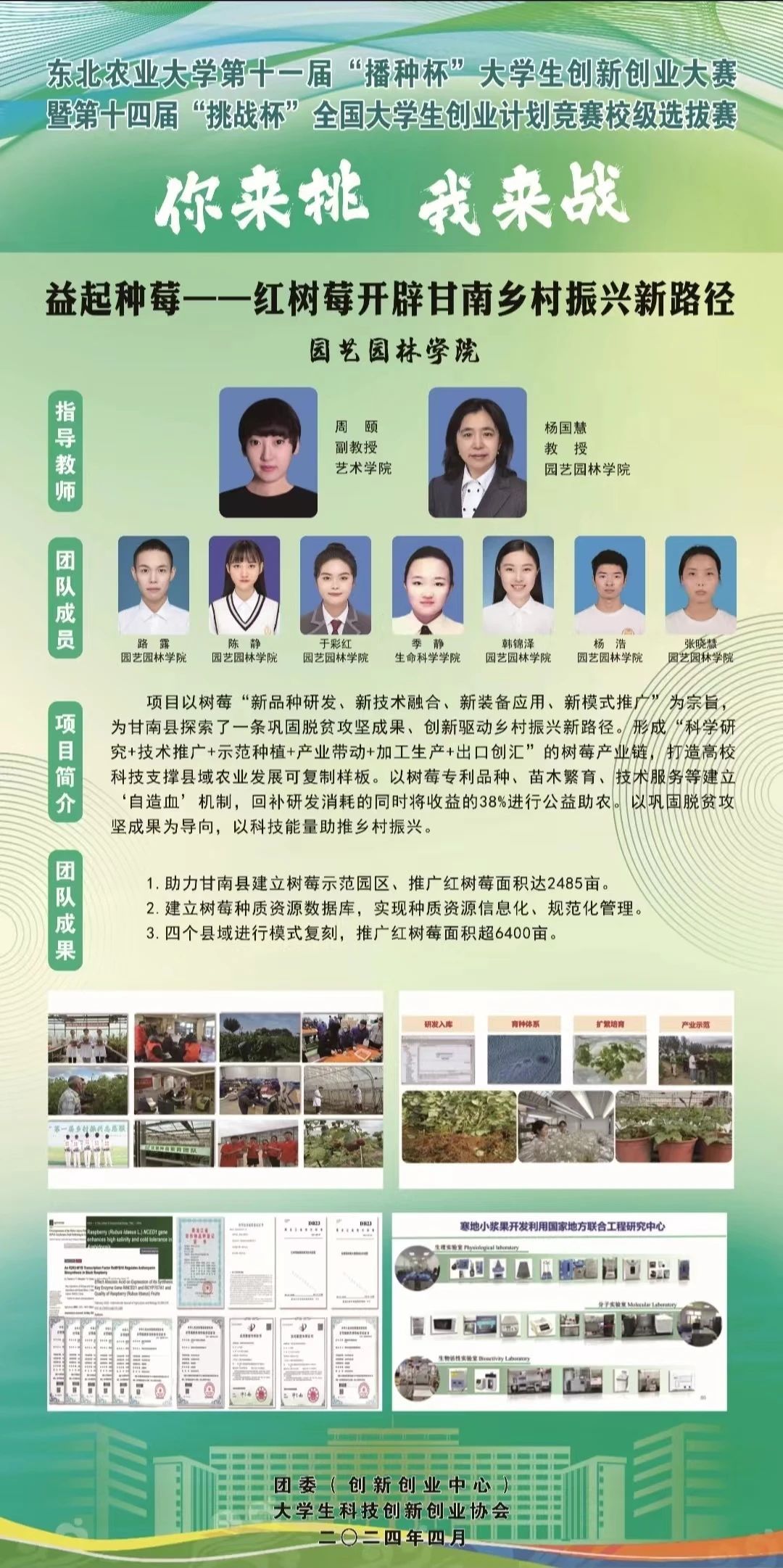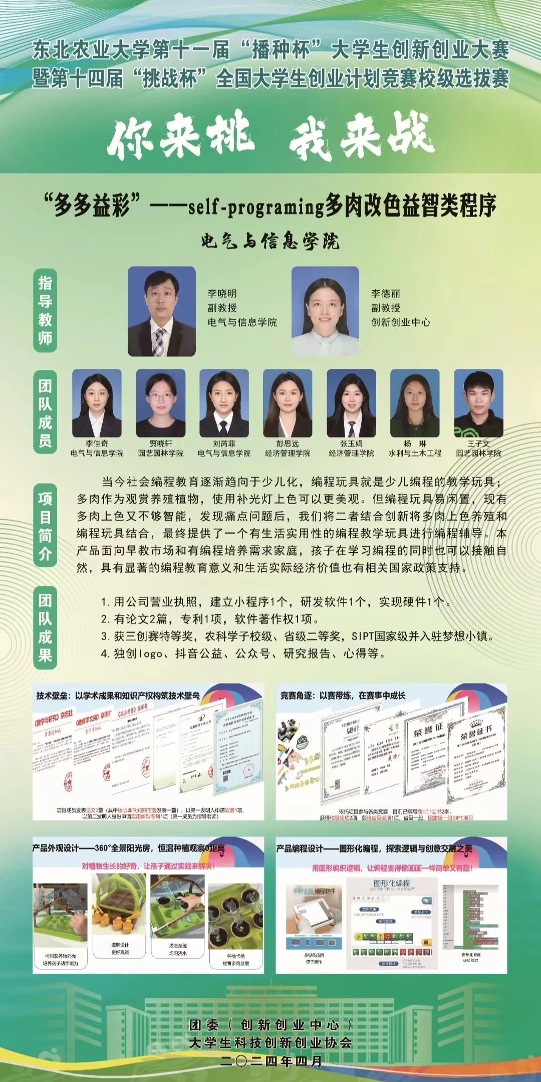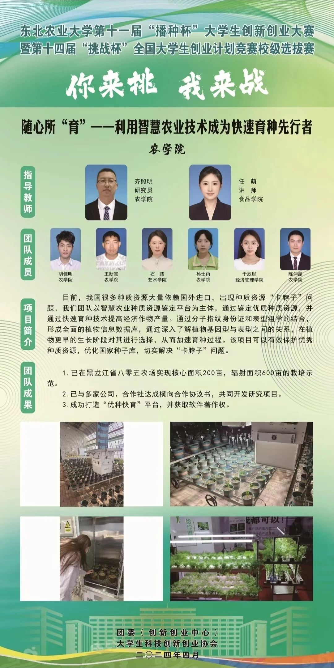 为深入学习贯彻习近平新时代中国特色社会主义思想,围绕中国式现代化建设中心任务,贯彻新发展理念、构建新发展格局、服务高质量发展,引导和激励大学生通过广泛的社会实践、深入的社会观察,不断增强对国情社情民情的了解,坚持创新引领创业、创业带动就业,落实黑龙江共青团关于服务青年“创新 创意 创业 创造”的工作要求,东北农业大学团委(创新创业中心)举办第十一届“播种杯”创新创业竞赛暨第十四届“挑战杯”大学生创新创业大赛校内选拔赛项目展示,力求进一步切实提高大学生的创新精神、创业意识和创新创业能力,助力更多优秀大学生筑梦龙江、建功龙江。