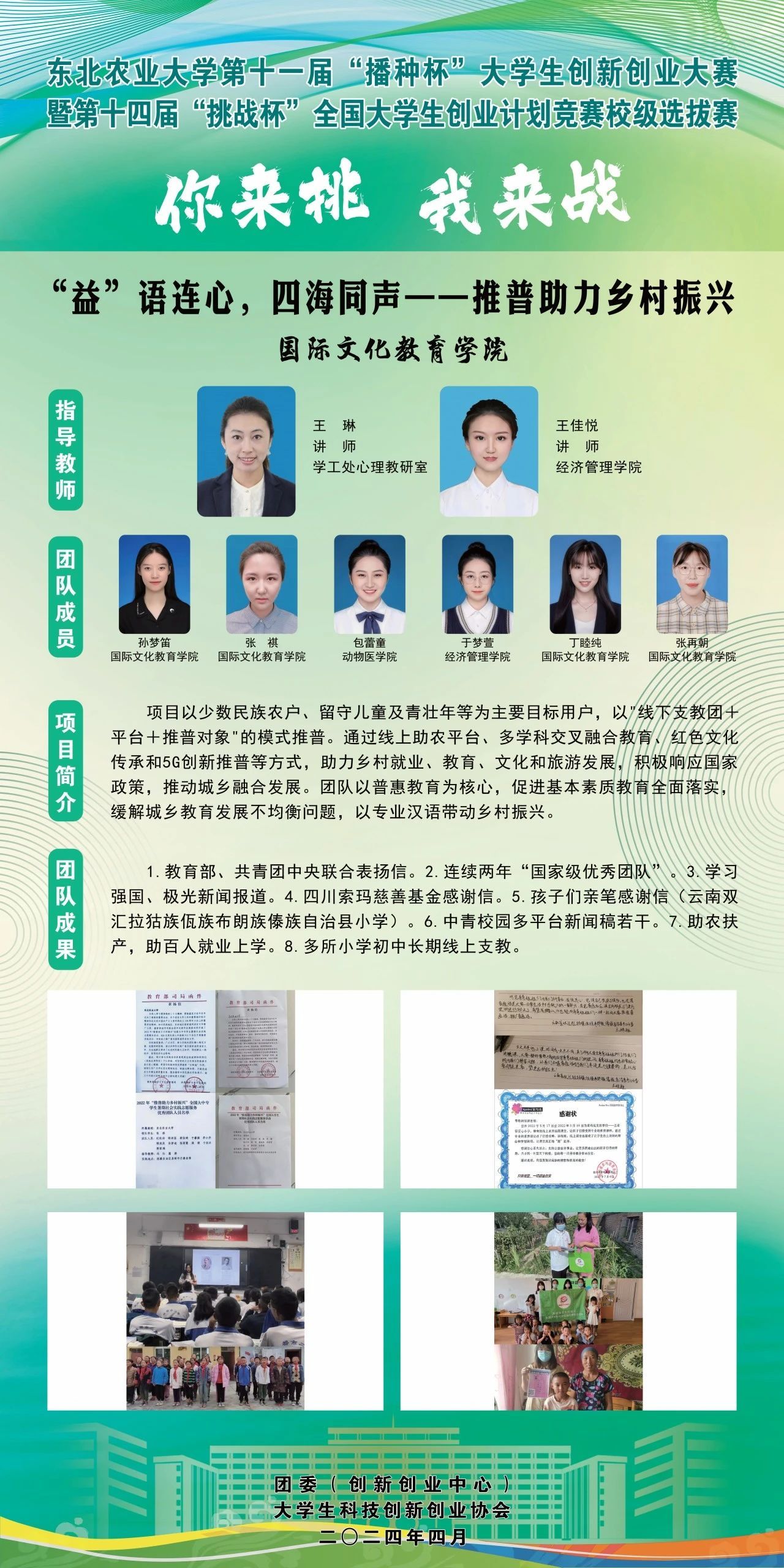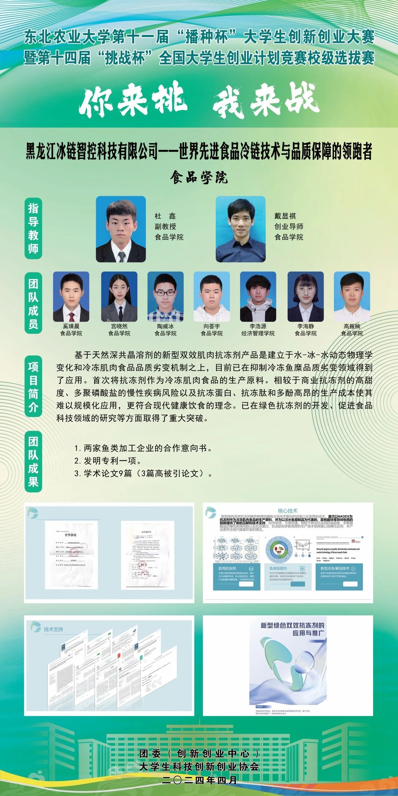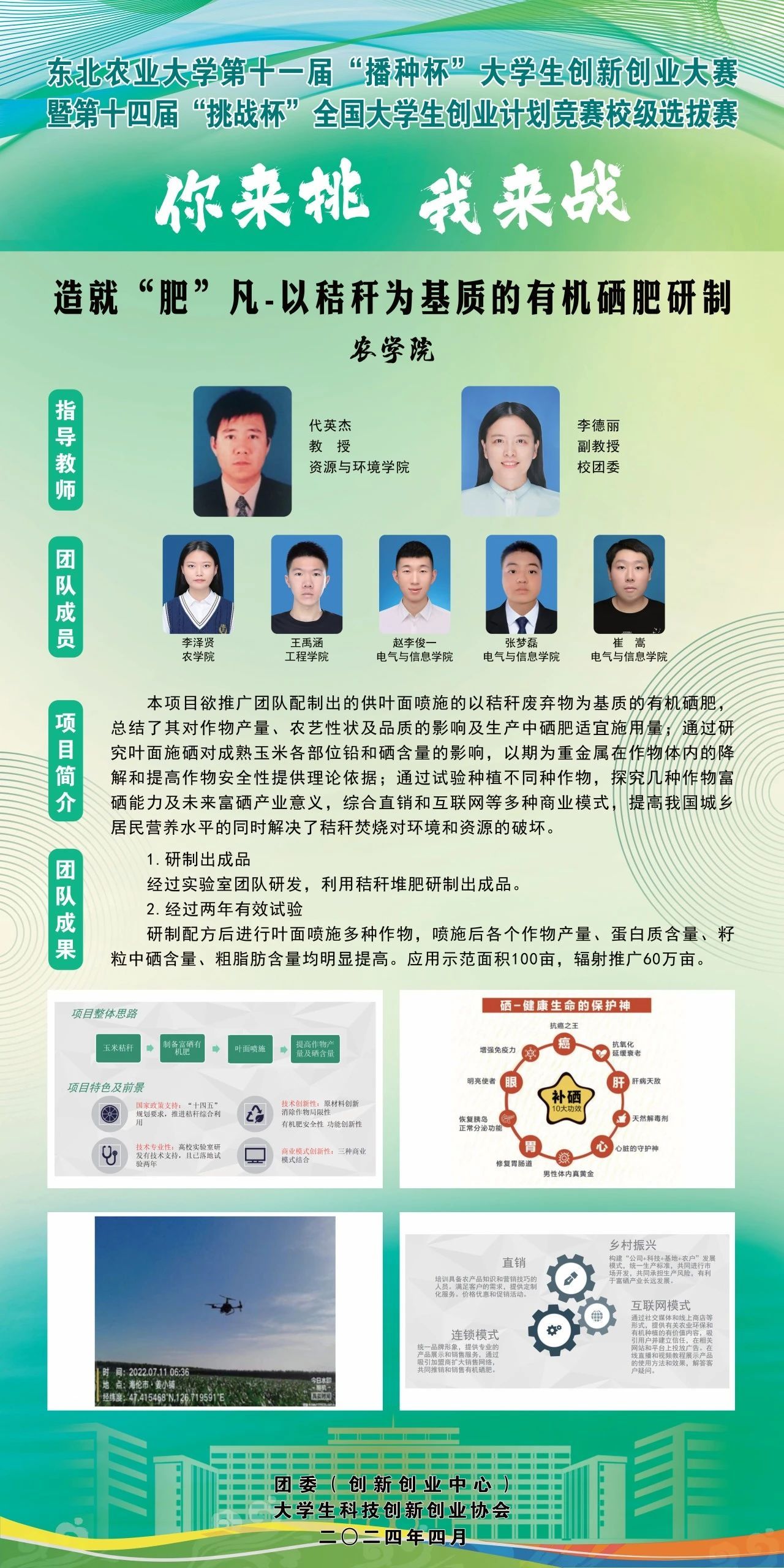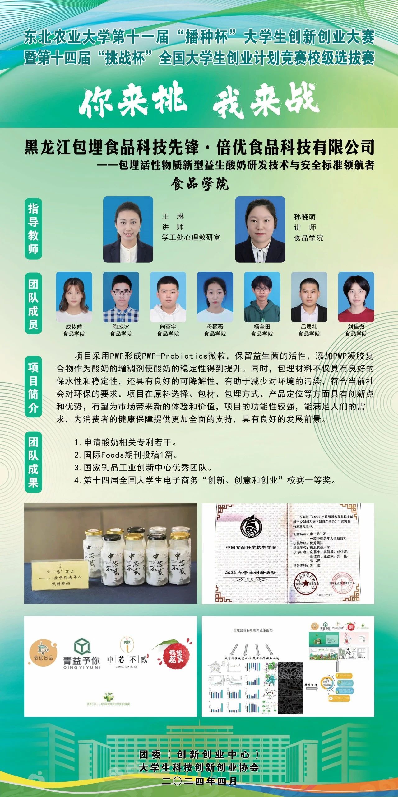 为深入学习贯彻习近平新时代中国特色社会主义思想,围绕中国式现代化建设中心任务,贯彻新发展理念、构建新发展格局、服务高质量发展,引导和激励大学生通过广泛的社会实践、深入的社会观察,不断增强对国情社情民情的了解,坚持创新引领创业、创业带动就业,落实黑龙江共青团关于服务青年“创新 创意 创业 创造”的工作要求,东北农业大学团委(创新创业中心)举办第十一届“播种杯”创新创业竞赛暨第十四届“挑战杯”大学生创新创业大赛校内选拔赛项目展示,力求进一步切实提高大学生的创新精神、创业意识和创新创业能力,助力更多优秀大学生筑梦龙江、建功龙江。
