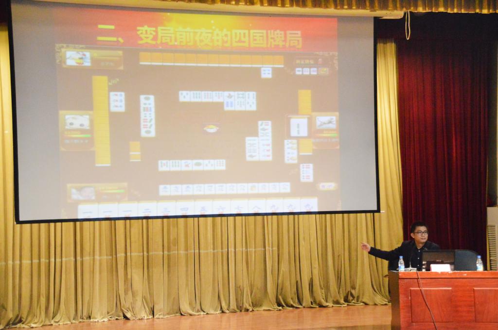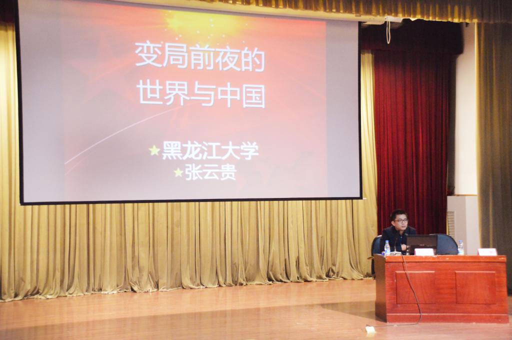 在近两个小时的报告中,张云贵老师以“变局前夜的世界与中国”为主题,以世界中心由北美向欧亚大陆转移为切入点,从世界体系面临变局、变局前夜的四国牌局、中国应对变局之策三个方面,用深刻犀利的语言为在场同学剖析了当今的国内外局势,给大家上了一堂生动的形势政策课。在谈到中美欧俄复杂多变的关系时,张老师形象诙谐的把中美欧俄比做牌局的四方,讲述了中国所面临的外界挑战和机遇。最后,张云贵老师指出,中国现在是具备强大的经济实力和军事实力的大国,在“一带一路”、“南海问题”等活动中的表现已经向世界证明:中国有信心有能力把自己的发展问题处理好,在发展的道路上突破阻碍,广大团员青年应该坚定理想信念,与祖国同呼吸共命运,中国的腾飞指日可待。