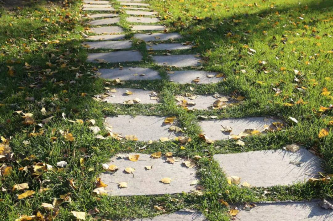 点缀着秋日落叶的绿色草坪上