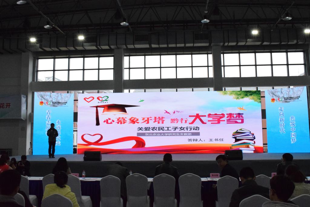 “心幕象牙塔·黔行大学梦”关爱农民工子女志愿服务项目在东农业大学校团委、团龙里县委的双重指导下由东北农业大学研究生支教团贵州龙里服务队于支教服务地黔南布依族苗族自治州龙里县启动实施,项目致力于解决农民工子女和留守儿童的教育及心理问题,通过学校+地方的模式,科学统筹,合理分配,保证了有效的社会资源作用于最真实的社会需求,使项目有序进行。截至目前,“心幕象牙塔·黔行大学梦”志愿服务公益项目已开展15期,累计筹集物资资金15万余元,辐射全县乡镇12所中小学校及2个留守儿童相对集中村寨,给1500余名山区同学送去了关爱。至今已开展15期,受益儿童达1000余人。