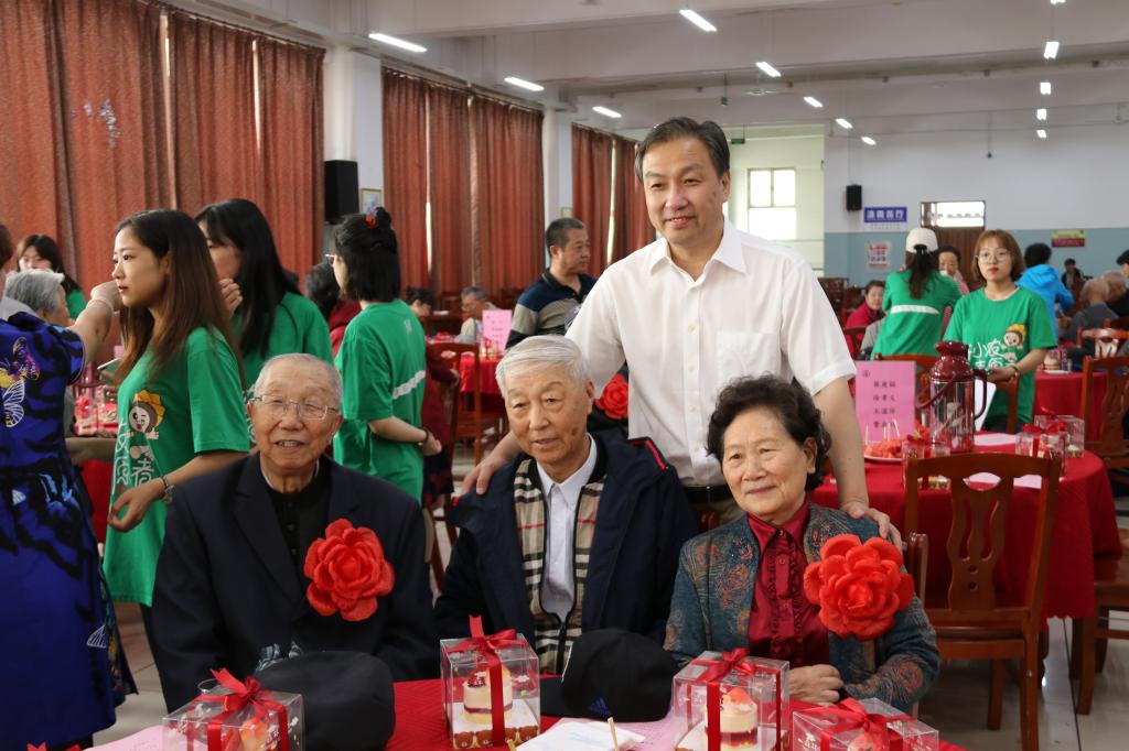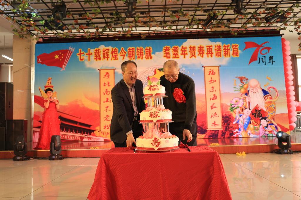 校党委副书记马宏坤与寿星代表一同切蛋糕并为寿星代表们献寿盘