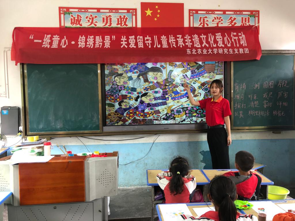 一纸童心·锦绣黔景项目以非遗传承人的高标准将贵州省黔南州非物质文化遗产龙里平坡苗族农民画带进课堂,带到留守儿童身边,让他们在绘画的世界中陶冶情操、磨练品性,有益身心健康成长。我校研究生支教团贵州服务地志愿者于2018年创办“一纸童心·锦绣黔景”活动。该活动已在龙里县水苔村大谷小学、龙里一小、龙里三中、龙里民中、王关社区、奋进社区等多地落地开展,让孩子们体验这个充满了获得感、幸福感和安全感的“乌托邦”。该项目累计拍卖作品80余幅,所获利润6000余元全部以爱心基金的形式发放给孩子们,受益人数达2000余人。