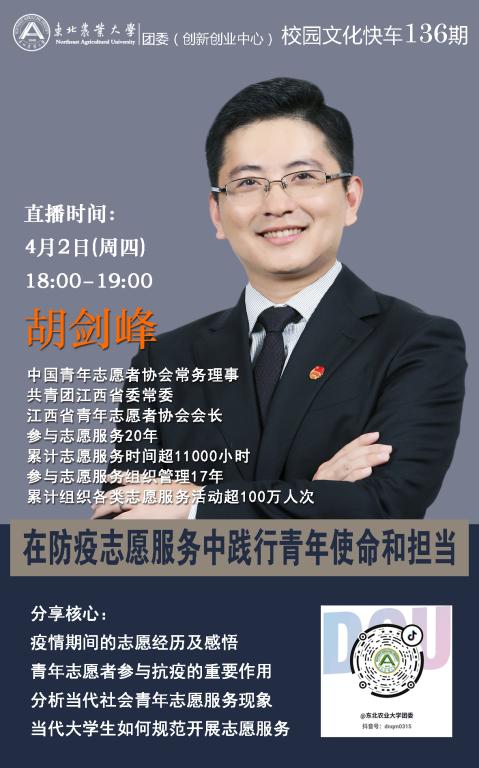 校团委特邀中国青年志愿者协会常务理事胡剑峰做客第136期校园文化快车——线上防疫系列讲座。胡剑峰参与志愿服务20年,累计志愿服务时间超11000小时,组织各类志愿服务活动超过100万人次。自疫情发生以来,他与同事搭建全省平台、统筹资源力量,多次向武汉、南昌社区捐赠口罩、测温仪等物资,并连续43天坚守在社区防疫一线。在这场抗疫“逆行”中,胡剑峰以实际行动展现青年担当,守护家国平安。
