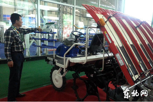 东农展示的国内最新技术插秧机。东北网记者王蕊 摄