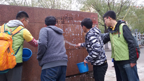 早7点30分,食品青站、党建工作人员与本学年入党积极分子共计84人一同前往建成社区。到达社区后,与社区工作人员接洽,志愿者由社区出发,分组清扫南直路、香城街、建成街、成标街街道和居民楼单元门上的小广告。