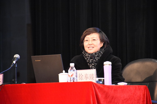 徐奉臻教授以《中国方案与中国智慧》为题,对党的十九大报告精神解读。他以十九大报告《决胜全面建成小康社会夺取新时代中国特色社会主义伟大胜利》为文本,分“学习十九大报告的意义价值”“党的十九大报告的结构框架”“报告的重点内容及创新思想”和“报告的主要特点与思考展望”四个部分,阐释了十九大报告的主题,梳理过去五年中国取得的历史性成就及面临的困难与挑战,明确新时代中国共产党的历史使命,明确习近平新时代中国特色社会主义思想的内涵、目标和本质,明确开启社会主义现代化强国建设新征程的“14个坚持”的基本方略,基于报告中所提及的未来中国的“三大历史任务”“五位一体”总体布局、“四个全面”战略布局和“五大发展”新理念,阐释了十九大报告中围绕“贯彻新发展理念,建设现代化经济体系”“健全人民当家作主制度体系,发展社会主义民主政治”“坚定文化自信,推动社会主义文化繁荣兴盛”“提高保障和改善民生水平,加强和创新社会治理”“加快生态文明体制改革,建设美丽中国”“坚持走中国特色强军之路,全面推进国防和军队现代化”“坚持‘一国两制’,推进祖国统一”“坚持和平发展道路,推动构建人类命运共同体”等内容所提出的创新性思想,围绕“坚定不移全面从严治党,不断提高党的执政能力和领导水平”,明确全面从严治党的总要求及相关举措,并总结了报告所具有的整体性、系统性和协调性之特点,展望了中国从站起来、富起来到强起来,并由此实现以富强民主文明和谐美丽的现代化强国为标志的未来愿景。