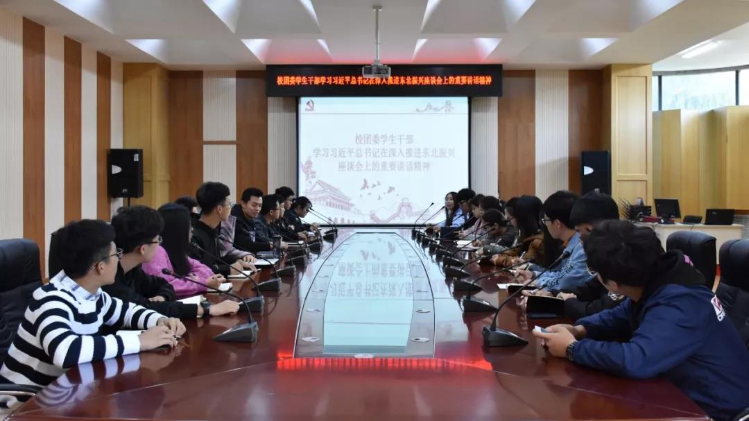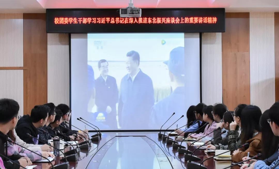中共中央总书记、国家主席、中央军委主席习近平于2018年9月抵达东北三省进行考察,主持召开深入推进东北振兴座谈会并发表重要讲话。为贯彻落实习近平总书记“以新气象新担当新作为推进东北振兴”的重要精神,凝聚更广泛的青年振兴之力,我校于2018年10月12日在音乐厅212组织校级学生组织学生干部学习习近平总书记在深入推进东北振兴座谈会上的重要讲话和考察黑龙江时的重要指示精神。