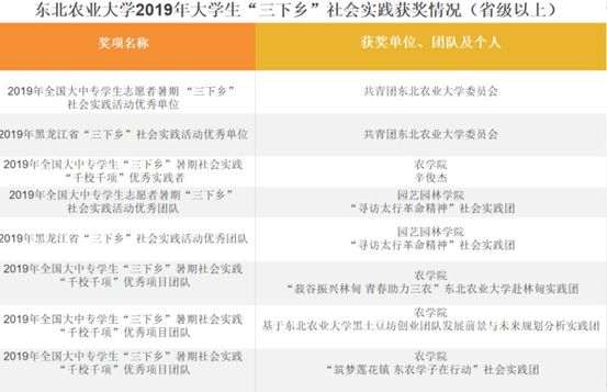 在2019年全国大中专学生志愿者暑期“三下乡”社会实践“千校千项”成果遴选活中,我校农学院“菽谷振兴林甸 青春助力三农,赴林甸实践团”、“基于东北农业大学黑土豆坊创业团队发展前景与未来规划分析实践团”、“筑梦莲花镇 东农学子在行动社会实践团”荣获“2019年全国大中专学生“三下乡”暑期社会实践“千校千项”优秀项目团队”,农学院辛俊杰同学荣获“2019年全国大中专学生‘三下乡’暑期社会实践“千校千项”优秀实践者”荣誉称号,我校社会实践获奖数量位居我省高校首位。