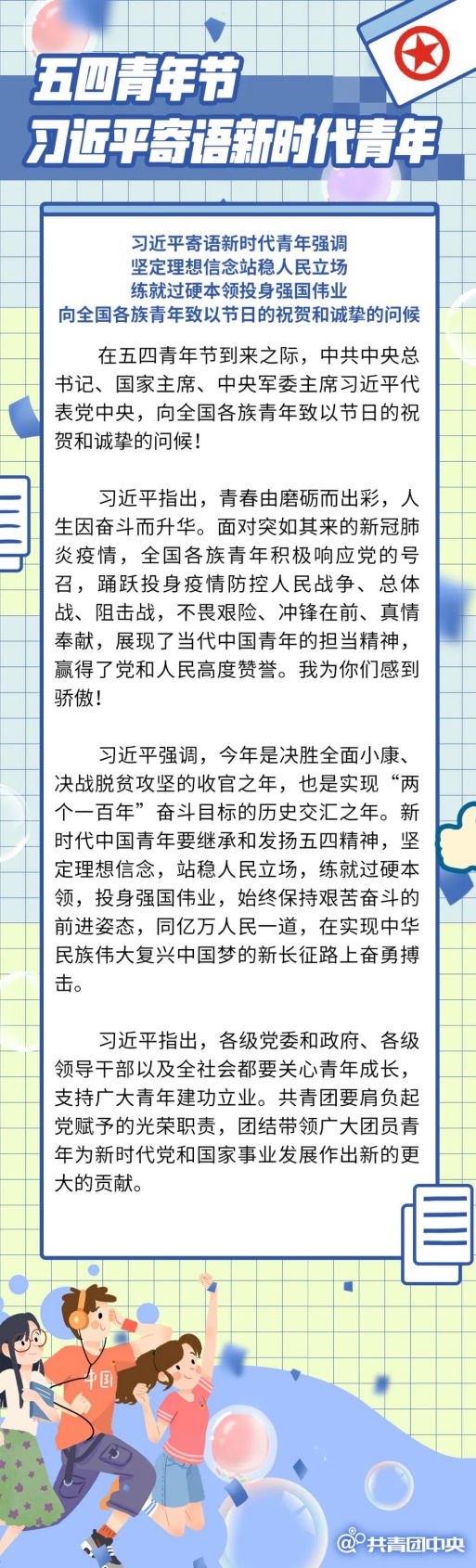 5月3日,中共中央总书记、国家主席、中央军委主席习近平总书记代表党中央,向全国各族青年致以节日的祝贺和诚挚的问候!习近平寄语新时代青年:坚定理想信念站稳人民立场,练就过硬本领投身强国伟业。