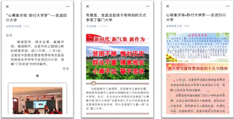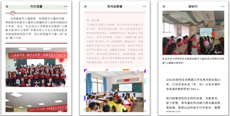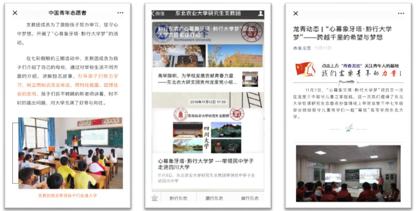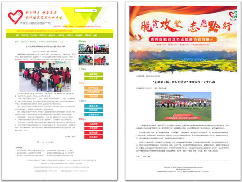 “心幕象牙塔·黔行大学梦”关爱农民工子女行动项目开展至今,受到中国青年网、贵州日报、多彩贵州网、贵州志愿服务网等10多家中央、省、市级主流媒体的关注。累计在网页、报纸、微信公众平台等媒体阵地上报道百余次。