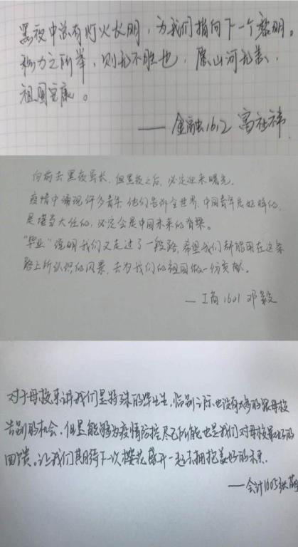 同时,毕业生进行了疫情防控知识学习及分享防疫英雄事迹等活动,学生们认识到,要明确国家与时代赋予的责任与使命,积极向抗“疫”英雄学习,响应国家号召,展现青年之精神,体现青年之风采。