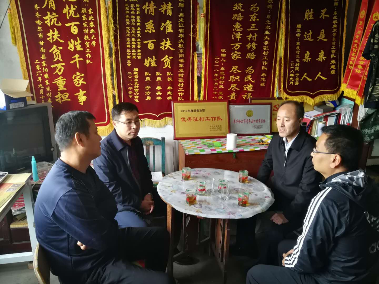 座谈会后,马宏坤与陈集慧等人共同前往东发村村委会和扶贫工作驻地,了解工作队生活和工作情况,并慰问我校驻村工作队成员。朱志猛汇报了工作队在精准扶贫、改善种植结构、基础设施建设以及争取社会资源等方面取得的成绩。重点汇报了“富尔农艺水稻良种繁育基地示范”项目、“免耕覆秸播种东农豆253”项目、“红树莓蓝靛果引种”项目、库区移民项目水泥道路硬化基础以及在19年水库泄洪后扶贫工作队和村民抢修堤坝的工作情况。陈集慧与东阳镇党委书记赵树山,镇长杨景慧,东发村党支部书记孔德友等高度评价我校驻村工作队入村以来的扶贫工作。