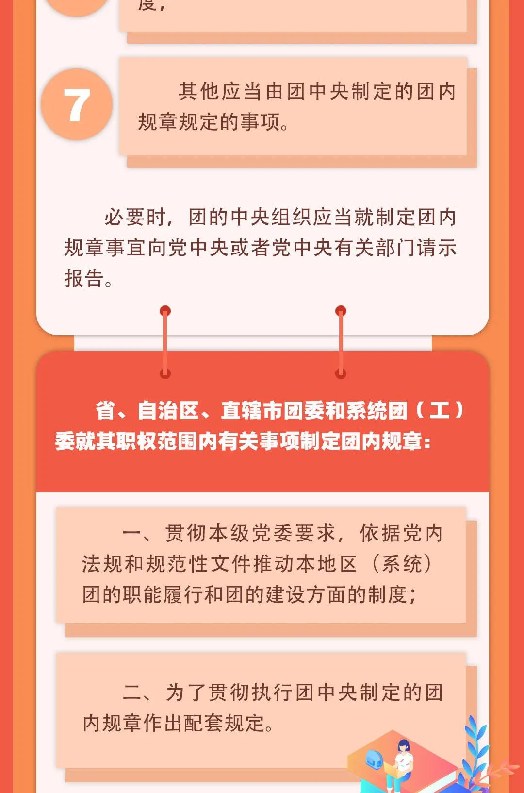 为了进一步提升团内规章建设的制度化、规范化、科学化水平,提高团内规章制定质量,保障团内规章的统一性、权威性,增强团内规章的执行力,共青团中央研究制定了《中国共产主义青年团团内规章制定条例(试行)》,并发出通知,要求各级团组织认真遵照执行。