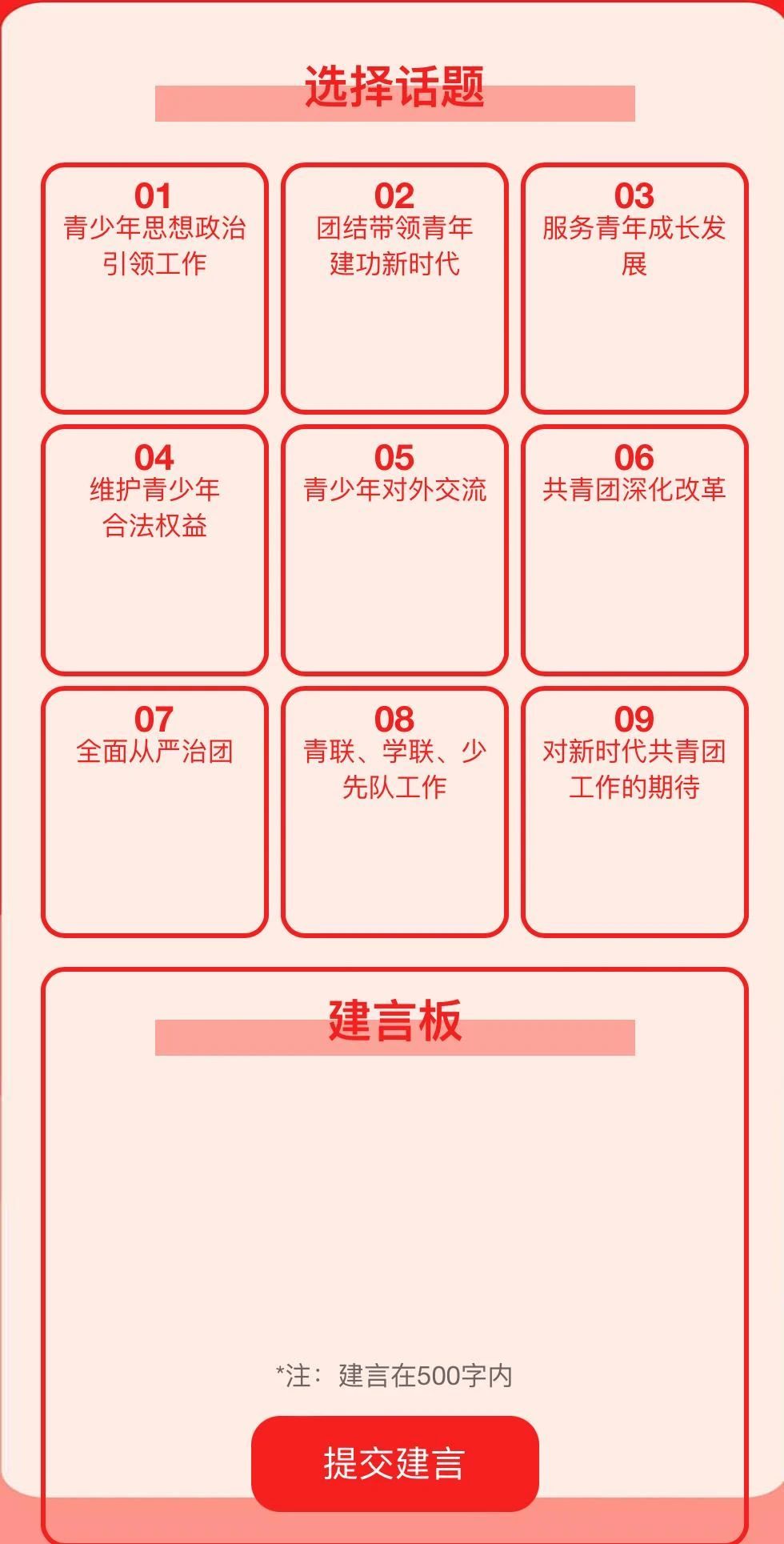 话题板块设置“青少年思想政治引领工作”、“团结带领青年建功新时代”、“服务青年成长发展”、“维护青少年合法权益”、“青少年对外交流”、“共青团深化改革”、“全面从严治团”、“青联、学联、少先队工作”、“对新时代共青团工作的期待”等类别,请参与者选择相应类别条目后提出建议(每条建议在500字以内)。