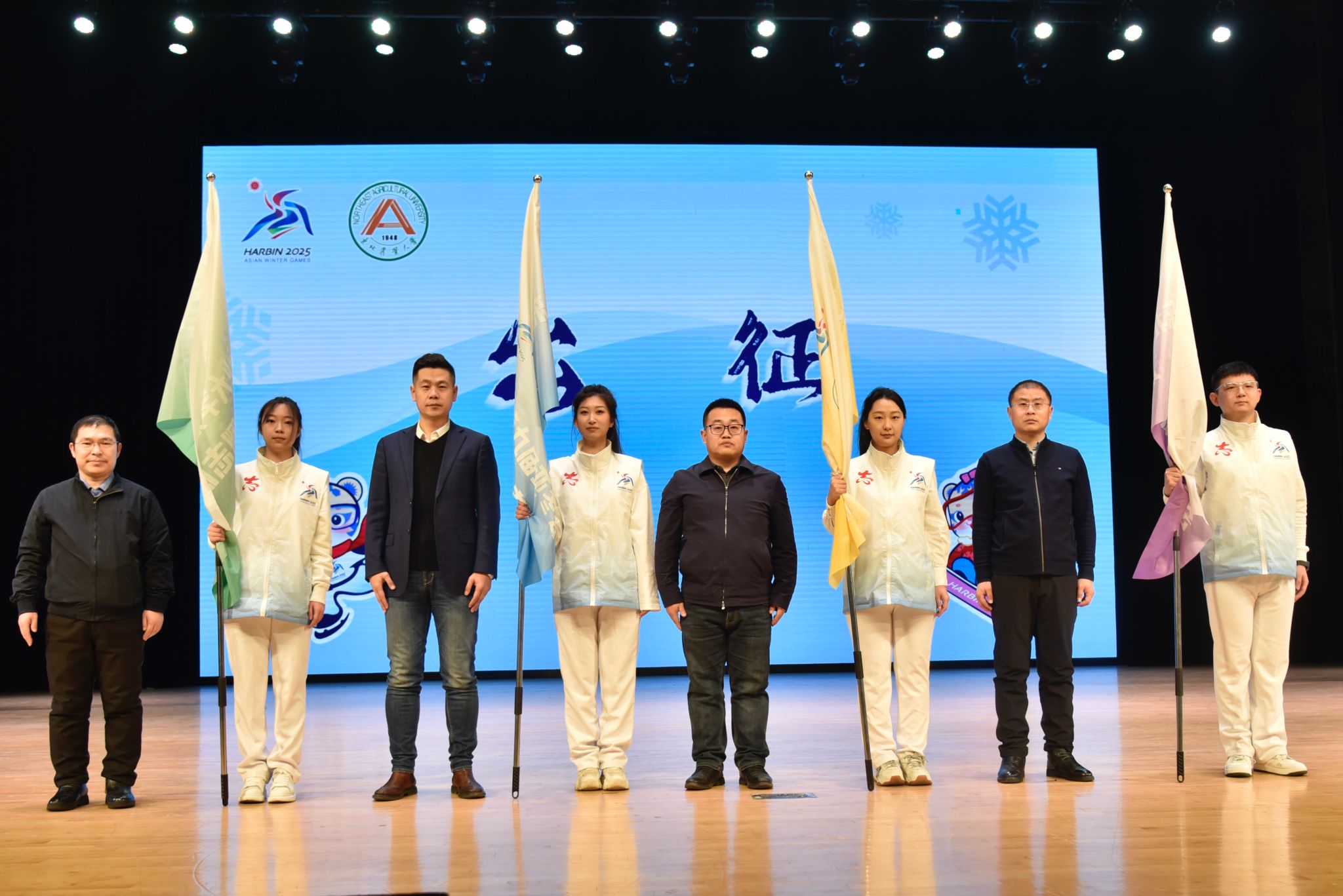 1月6日,我校亚冬会志愿者出征仪式暨安全培训会在音乐厅剧场举行,校党委副书记贺景平出席,公共管理与法学院院长兼教务处负责人杜国明、后勤管理处处长王伟峰、学生工作部(学生处、武装部)副部(处)长刘双奇、保卫处副处长陈亮为志愿者出征授旗。水利与土木工程学院辅导员袁帅和经济管理学院学生刘昱彤代表志愿者师生作表态发言,教师志愿者、校团委教师王琳带领全体亚冬会志愿者宣誓。贺景平在出征寄语中勉励大家要发扬团结协作的精神、坚持专业专注的态度、保持昂扬向上的心态,并祝愿大家出征顺利、平安凯旋。出征仪式后,校团委组织全体志愿者进行了专题安全培训。