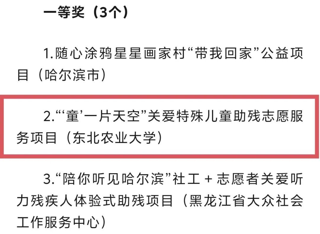 此前,该项目已斩获黑龙江省志愿服务项目大赛银奖、铜奖等多项荣誉。此次再获佳绩,不仅彰显了项目在助残服务领域的示范引领作用,更展现了我校青年用爱心践行志愿精神、用行动推动社会包容进步的责任担当。未来,项目将继续深耕特殊儿童关爱领域,为黑土地上的助残事业注入更持久的青春力量!
