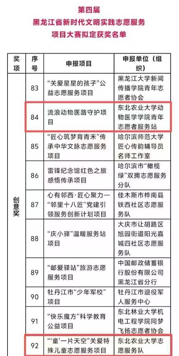 在志愿服务项目大赛中,经过申报推荐、审核评选等环节,动物医学学院的“流浪动物医路守护项目”与校青年志愿者协会“‘童’一片天空”关爱特殊儿童志愿服务项目,分获创意奖;