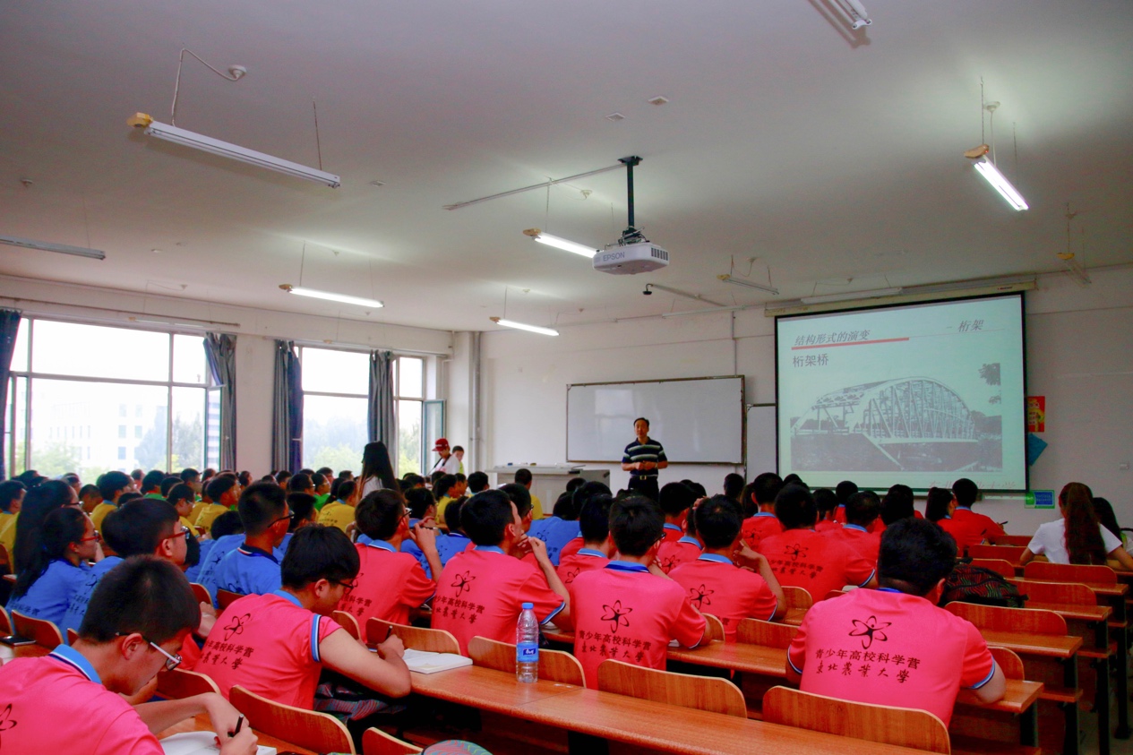 王洪涛老师以建筑的起源为开端,简要概括了旧石器时代和新石器时代的建筑结构,并着重介绍了结构的演变过程,从早期的梁柱结构、到后期的桁架结构、再到悬索结构,建筑结构演变经历了漫长的过程。最后,王老师强调了制作轴心受力杆件时的注意事项:要保证结构的稳定性,同时也要注意细长压杆易失稳破坏性。王老师的讲解清晰明了、通俗易懂,同时,他教导营员们通过调动高中知识储备来理解大学课程,激发了营员们探索知识的主观能动性,使营员们受益匪浅。
