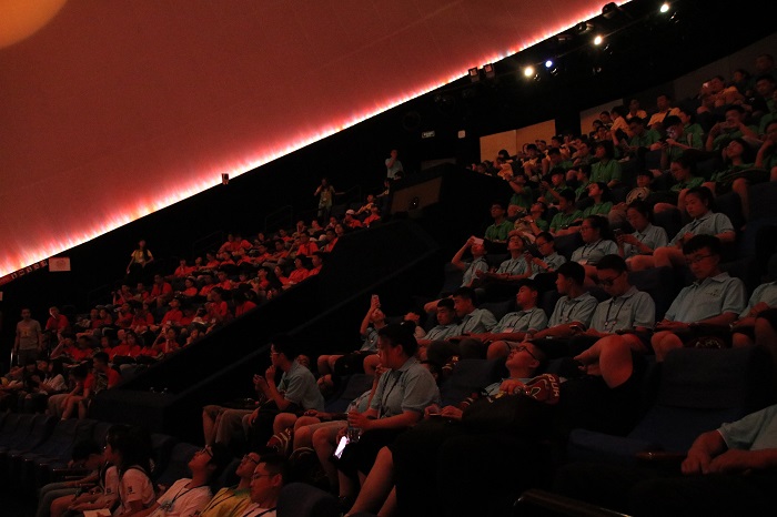科技馆入口是IMAX球幕影院,营员们进入影院观看4D电影——《狂野非洲》。在影片开始前,工作人员简单介绍了球幕影院的幕布结构,胶片种类及声道分布。该4D影片用绚丽的4D视听效果为大家展示了非洲动物的生活情况,热带雨林的自然条件、地形的变迁以及旱灾时的动物们的迁徙场景。