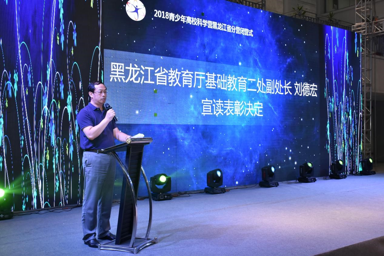 闭营式上,黑龙江省教育厅基础教育二初副处长刘德宏宣读关于优秀志愿者、优秀营员、优秀带队教师的表彰决定。全国高校科学营东北农业大学分营在此次活动中表现突出,经评选,共产生了30名优秀营员和15名优秀带队教师。