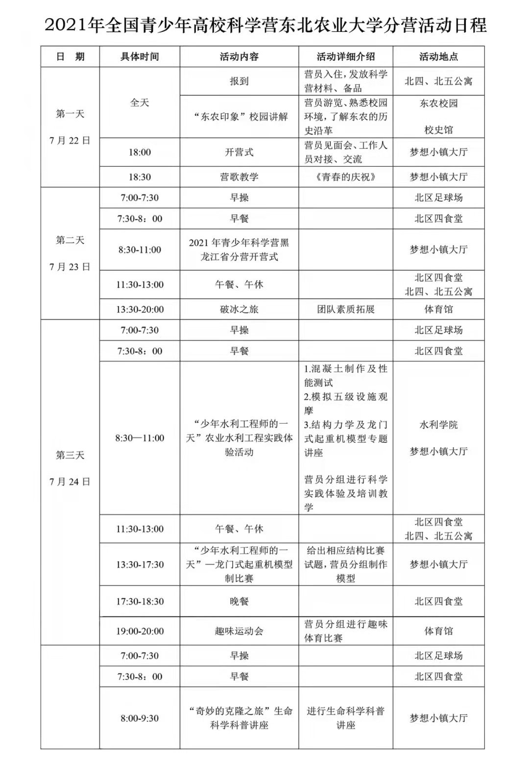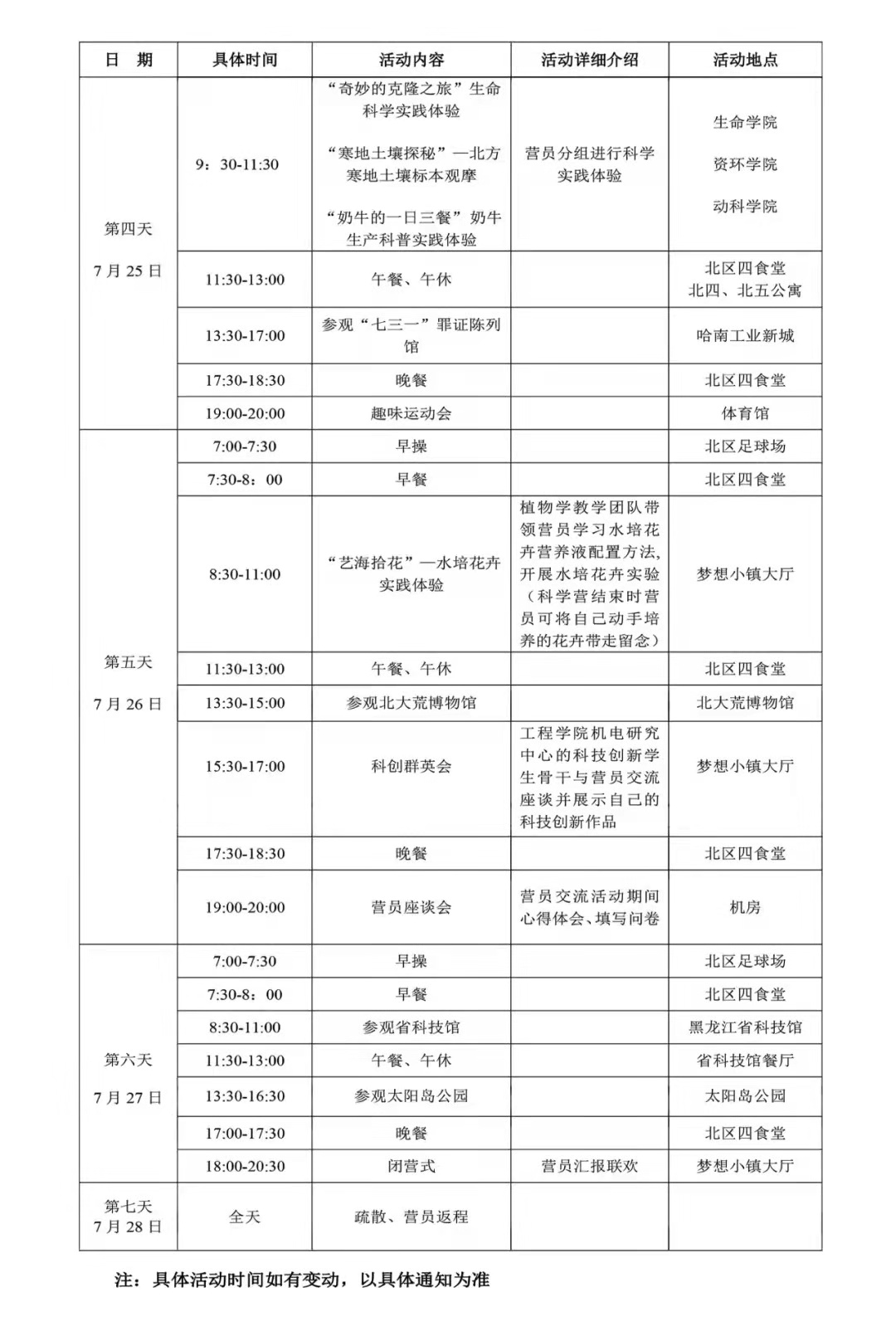 1. 东农讲坛。邀请我校知名专家学者为营员讲述当下的现代农业科技热点,教育和引导学生用科学的方法和视角看待问题,激发学生对科技创新的热情。