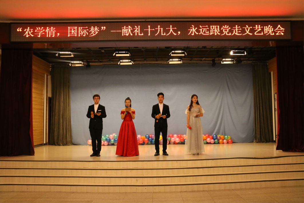 为庆祝党的十九大顺利召开,深入学习领会党的十九大精神,2017年11月5日晚六点,农学院与国际文化教育学院在大学生活动中心联合举办了“农学情•国际梦”--献礼十九大,永远跟党走主题文艺晚会。国际文化教育学院团委书记洪丹、学生会秘书长徐日月,农学院学生会秘书长王继伟及两院全体大一新生出席了本次晚会。