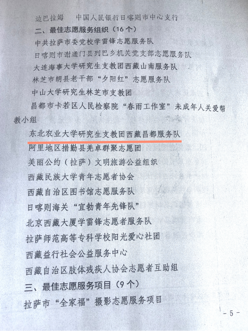 为响应“到西部去,到基层去,到祖国最需要的地方去”的号召,东北农业大学累计派遣五届研究生支教团成员服务于西藏自治区昌都市第二高级中学。几年来,西藏昌都服务队踏实教书育人,协助行政工作,开展志愿服务,拓展第二课堂,获评2019年西藏自治区最佳志愿服务组织。