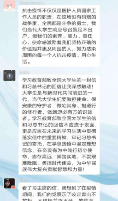 大学生既处在一个可以唯唯诺诺听从命令的年纪,也处在一个可以承担责任勇敢付出的年纪。国家对我们这些大学生充满着殷切的期望和关怀。我想,在这个时候,就应该是当代大学生承担付出的时候。我们不信谣、不传谣,争做社会主义理智者、践行者。我们计划出行,不为国家添乱。我们停课不停学,不落下课程。放假并不等于休息玩乐,我们依然会每天坚持锻炼。我们也会关注时事,与时俱进