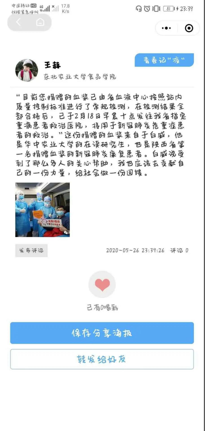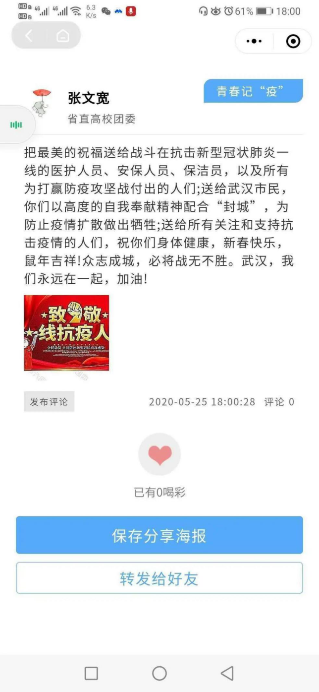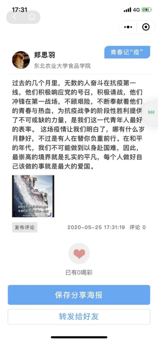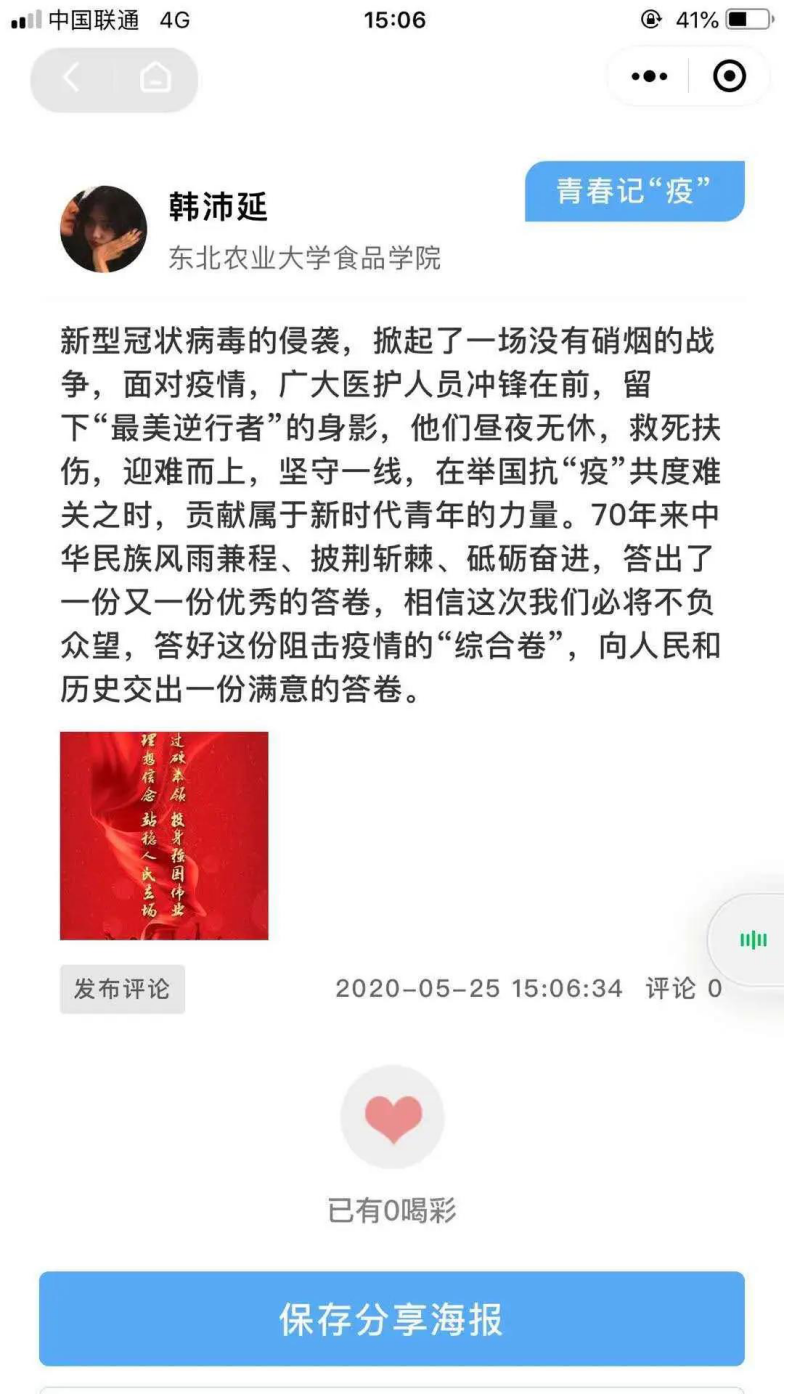 新冠肺炎疫情发生以来,在党中央,国务院的坚强领导下,全国人民众志成城,各行各业守望相助,在疫情防控的每个地方每时每刻都发生着许许多多的故事,真实的感动和激励着我们。为激励和引领广大青少年进一步坚定制度自信,凝聚必胜信念,共筑防疫长城,省团委以“黑龙江共青团”微信小程序“龙青驿站”为平台,开展了“青春记疫”线上主题活动,食品学子响应号召,积极参与活动,记录“疫”路前行中的人和事,留下珍贵的青春记“疫”。同学们的参与度很高,反响热烈。照目前疫情的局势来看,即使在逐渐复工复学的形式面前也不可轻举妄动,时刻听从党的指挥。国家之本在于人民,疫情当前,作为当代青年更应唱响中国力量。在举国抗“疫”,共度难关之时,时刻牢记同学们作为新时代青年的责任感、使命感,为构筑人类命运共同体贡献属于我国新时代青年的每一份精神力量。下面是同学们的一些优秀评论的展示: