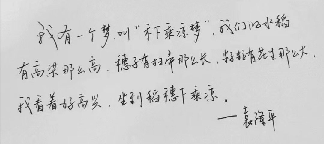 “发展杂交水稻,造福世界人民”是袁隆平毕生的追求。“饭碗牢牢掌握在我们中国人手中”是袁隆平最大的愿望。为了实现这一宏愿,他长期致力于促进杂交水稻走向世界,把一生浸在稻田,把功勋写在大地上。袁先生,您是我们的楷模,矢志躬耕于田野之间,不求闻达于天下,丹心为国为民,您是高尚的人,是永远有益于人民的人。