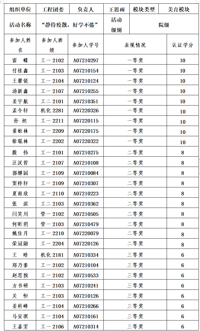 此次活动圆满完成,同学们不仅展示了自己积极向上的线上生活,还展现出了为理想奋斗的坚定信念和共度疫情的监督决心,即使疫情形势严峻但我们学习的热情丝毫不减,我们应在以后继续保持状态,共度疫情难关,静待疫散!