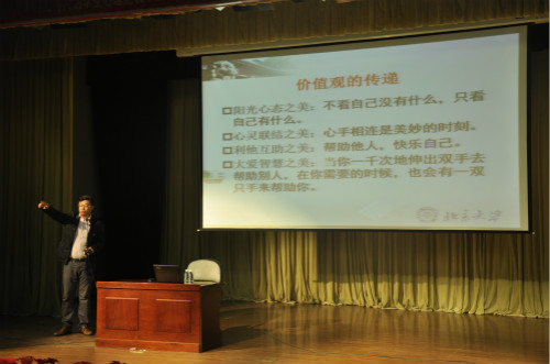为了帮助新生迅速适应大学生活,构建积极健康的心里模式,预防心理危机,9月15日,由学生工作处、校团委主办,青年传媒中心承办的半亩方塘讲座,在图书馆报告厅举行。本期嘉宾为北京大学心理健康教育与咨询中心主任刘海骅,我校各学院新生学代表500余人聆听了讲座。团省委学校部副部长曲天宇、学生工作处副处长肖冬梅、校团委副书记崔丽等参加了活动。在近两个小时的讲座中,刘海骅老师从心理资本的视角为新生们带来了精彩深刻的入学教育。刘海骅老师以大学生的生活态度为开端,从多种角度为新生全面指导怎样在心理上适应大学生活。在与同学们谈及社会比较时,刘老师说道:“每个人的注意力就是我们认识世界的方式,有时注意力对于我们来说就是现实。如果你能看到自己的特点,充分发挥自己的优势,那么你就可以越做越好。有时也要把注意力放在赶超差距上,才能更好地提升自己”。